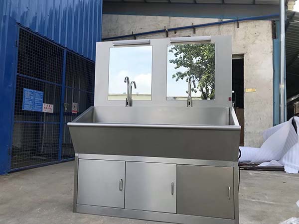 醫用不銹鋼洗手池采用優質304不銹鋼板制造,耐腐蝕,抗晶間腐蝕。不銹鋼醫用洗手池有單人、雙人、三人、四人及多人洗手池,出水方式有自動感應式、膝碰式、腳踏式。可自行選購電熱水器、不銹鋼出刷器。醫用不銹鋼洗手池的優點:1. 全自動感應或腳踏的給水方式,避免醫護人員的手部碰觸,有效防止洗手時的交叉感染;2.